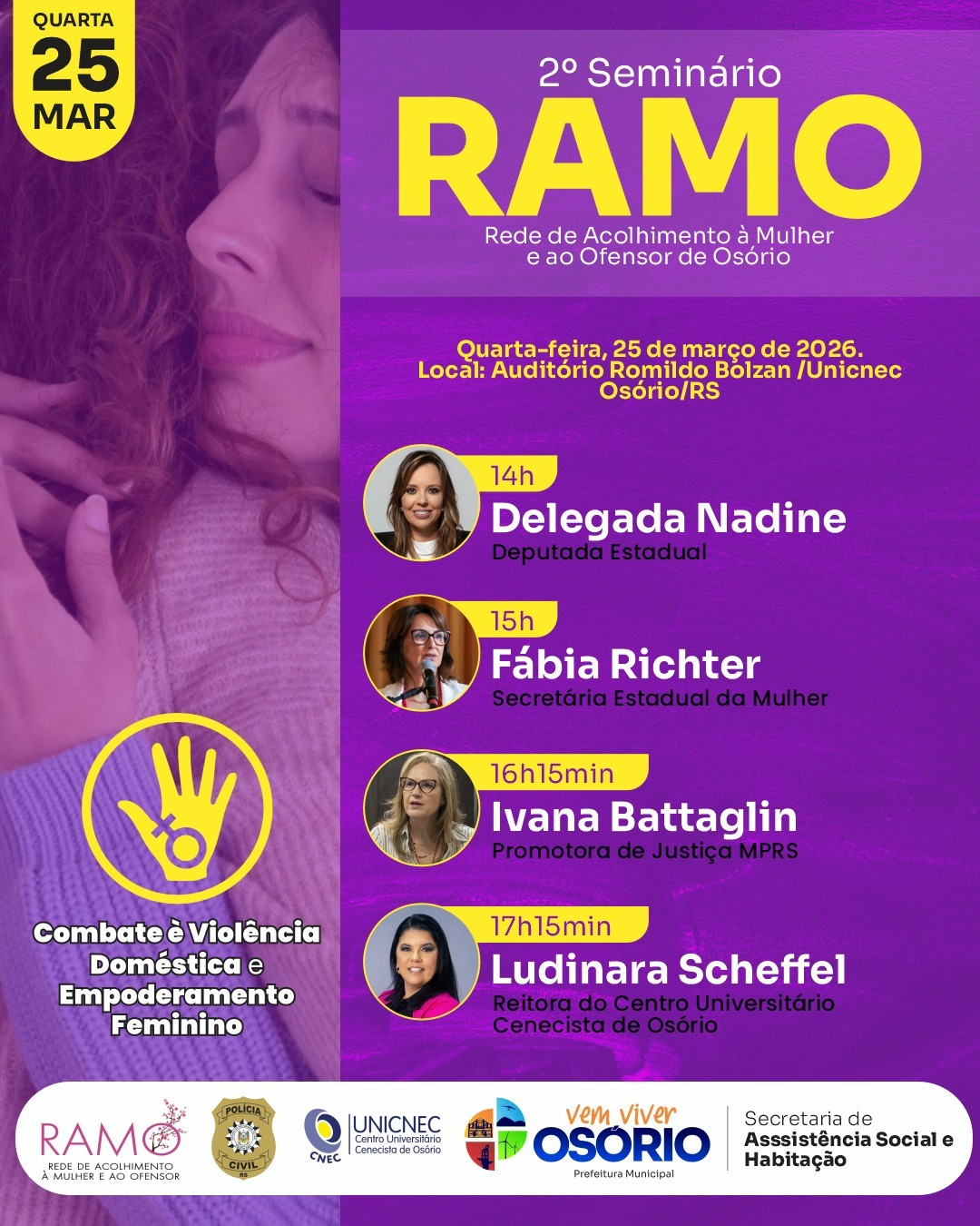 A realização é da RAMO – Rede de Acolhimento à Mulher e ao Ofensor, com apoio da Polícia Civil do Rio Grande do Sul, do Centro Universitário Cenecista de Osório (UNICNEC), da Prefeitura de Osório por meio da Secretaria de Assistência Social e Habitação. O evento é aberto ao público interessado no tema, incluindo profissionais da rede de proteção, estudantes e comunidade em geral.