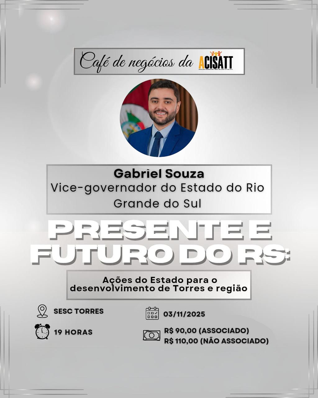 A Associação Comercial e Industrial de Torres (ACISATT) realiza no próximo 3 de novembro, a partir das 19h, no SESC Torres, mais uma edição do Café de Negócios, que contará com a presença especial do vice-governador do Rio Grande do Sul, Gabriel Souza. O evento promete ser um espaço de diálogo direto sobre políticas públicas e ações estratégicas voltadas ao desenvolvimento de Torres e do Litoral Norte.