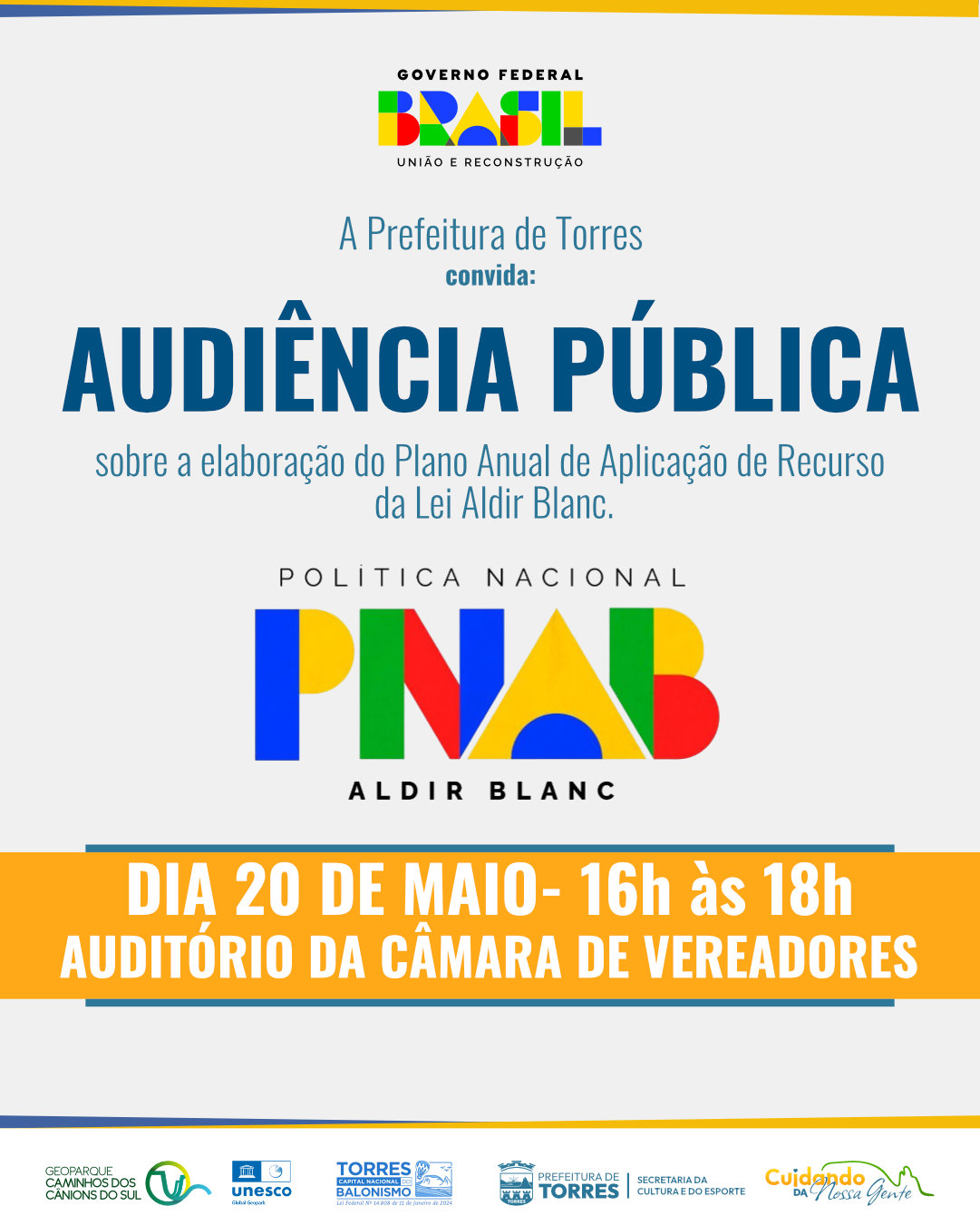 A prefeitura de Torres, por meio da Secretaria de Cultura e Esporte, convida artistas, fazedores de cultura e agentes criativos do município para participar da Audiência Pública sobre a aplicação dos recursos da Política Nacional Aldir Blanc (PNAB – Ciclo 2). O encontro será no dia 20 de maio, terça-feira, das 16h às 18h, na Câmara Municipal de Torres.