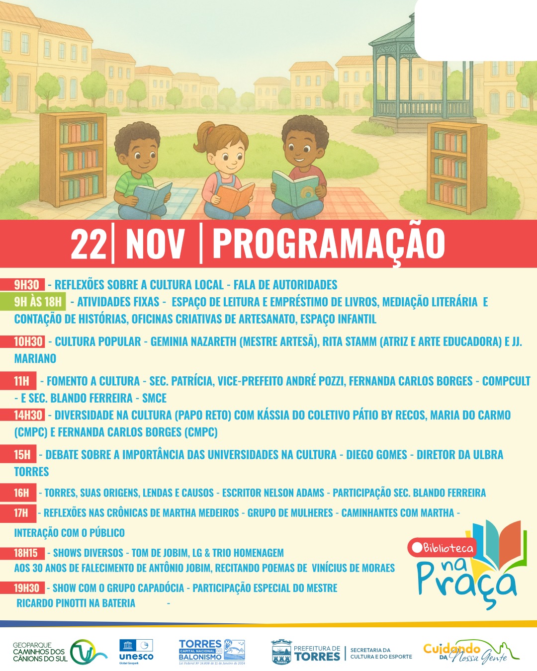 A Prefeitura de Torres, por meio da Secretaria Municipal da Cultura e Esporte, divulga a nova programação oficial do Biblioteca na Praça 2025, evento que valoriza a leitura, a cultura local e a produção artística torrense. Com mudança de datas, a iniciativa passa a ocorrer nos dias 21, 22 e 23 de novembro de 2025, na Praça XV de Novembro, reunindo atividades literárias, atrações culturais e shows musicais.