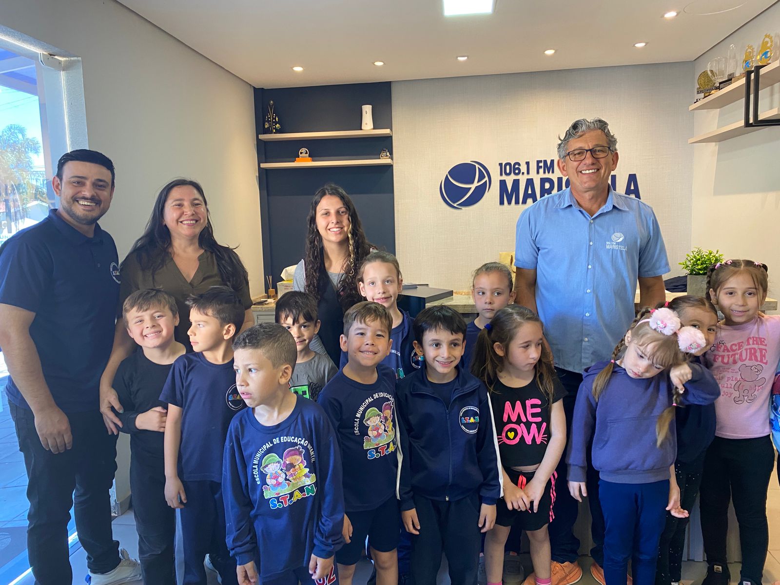 A manhã da última terça-feira (14) foi de entusiasmo e aprendizado no estúdio da Rádio Maristela, em Torres. O comunicador Pe. Leonir Alves, durante o programa Revista Maristela, recebeu os professores Elaine Regina Alegre Henriques e Diogo Siman, a monitora de inclusão Eduarda Porto e as crianças do Pré 2C da EMEI Stan, que participaram de uma entrevista especial sobre o projeto de pesquisa de mestrado da Universidade Federal do Rio Grande do Sul (UFRGS). A visita integra a pesquisa conduzida pela professora e mestranda Elaine Regina Alegre Henriques, sob orientação da professora doutora Maria Carmen Silveira Barbosa.