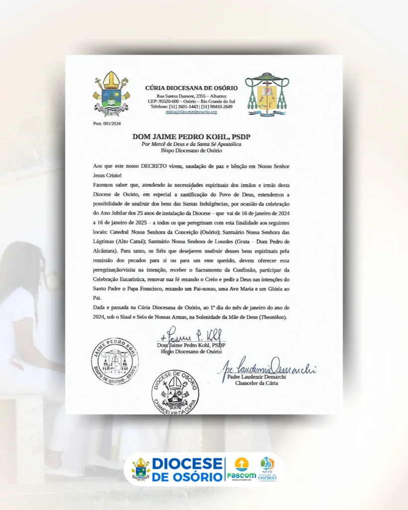 O Bispo da Diocese de Osório, dom Jaime Pedro Kohl, emitiu em 1º de janeiro de 2024 o decreto que concede a possibilidade de lucrar indulgências por ocasião da celebração do Ano Jubilar dos 25 anos de instalação da diocese. O decreto, válido de 16 de janeiro de 2024 até 16 de janeiro de 2025, oferece a oportunidade ao povo de Deus de usufruir desses bens espirituais em locais específicos.