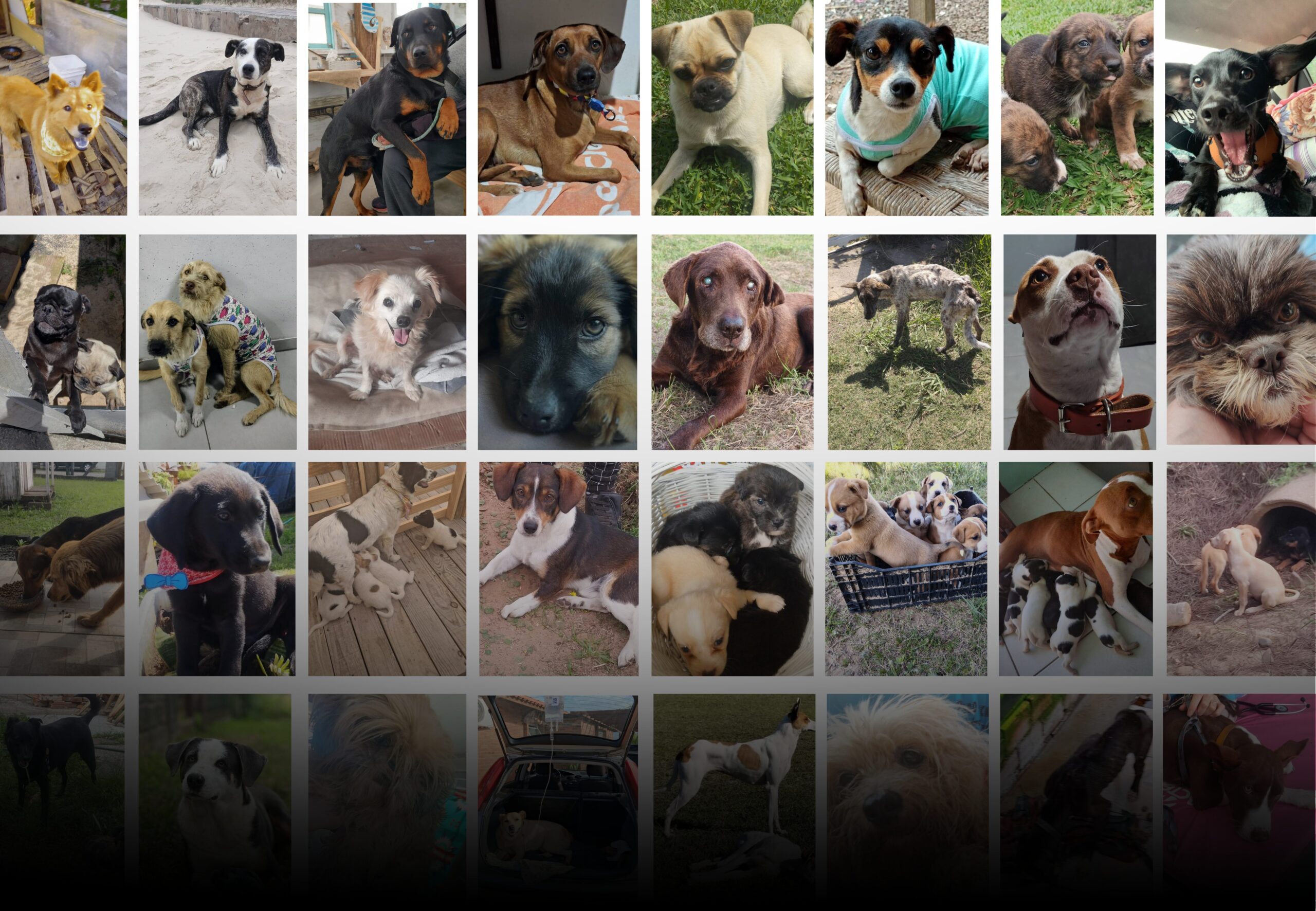 Para a reportagem, foi feita uma seleção de fotos de vários animais resgatados por protetores voluntários. No entanto, durante a produção e até o fechamento da matéria, novas imagens de cães abandonados foram recebidas, e continuam chegando.