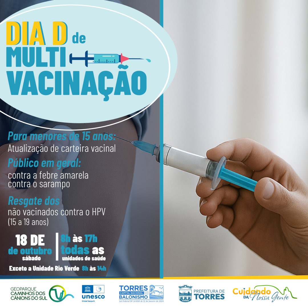 A Prefeitura de Torres promove no próximo sábado (18) o Dia D de Mobilização Nacional da Vacinação, uma iniciativa que visa ampliar o acesso da população às vacinas e reforçar a importância de manter a caderneta de imunização atualizada. Todas as salas de vacinação das Estratégias de Saúde da Família (ESFs) estarão abertas das 8h às 17h, garantindo atendimento ao longo de todo o dia e facilitando que famílias completem os esquemas vacinais de crianças, adolescentes e adultos.