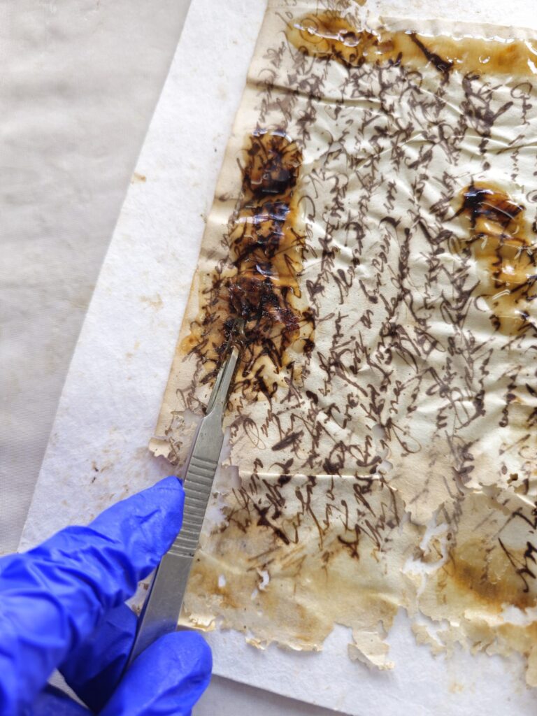 Outra técnica aplicada foi o reenfibramento mecânico, no qual fibras de papel são reintegradas às áreas perdidas, reconstruindo partes deterioradas.
