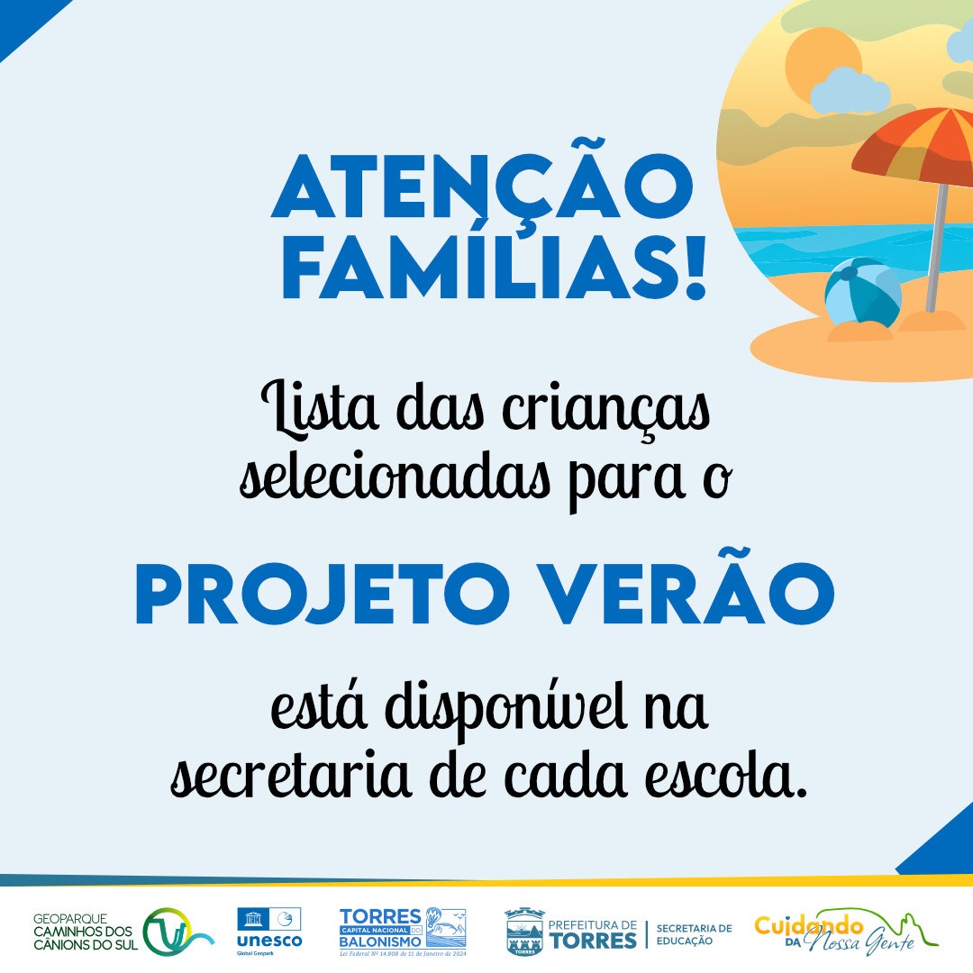 A Prefeitura de Torres, por meio da Secretaria Municipal de Educação, informa que já está disponível a lista das crianças selecionadas para participar do Projeto Verão. As famílias podem consultar os nomes diretamente na secretaria da escola em que o estudante está matriculado.