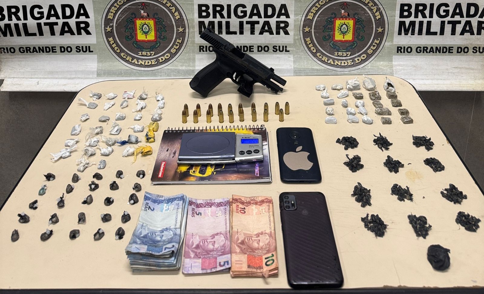 No local, foram encontradas uma pistola, 19 munições, 58 porções de maconha, 132 porções de crack e 25 porções de cocaína, além de valores em dinheiro e outros materiais relacionados à atividade criminosa. A dupla foi detida em flagrante e encaminhada às autoridades competentes para os procedimentos legais.