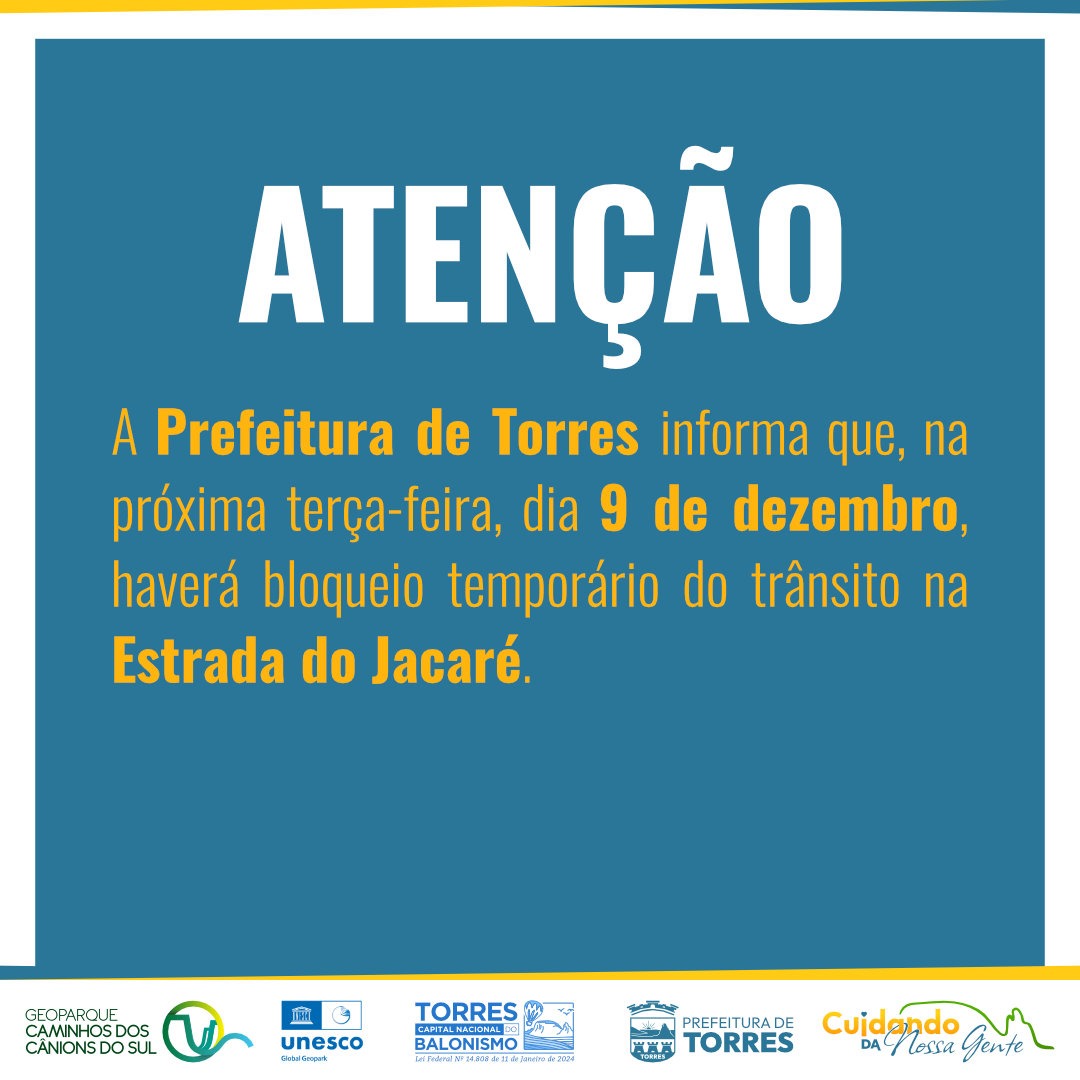 A Prefeitura de Torres informa que na próxima terça-feira, 09 de dezembro, haverá bloqueio temporário do trânsito na Estrada do Jacaré. A intervenção é necessária para a execução da etapa final de drenagem previstas para o local.