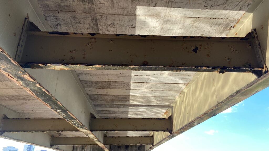 A Nota afirma ainda que durante os trabalhos de inspeção, foram identificados sinais de oxidação, corrosão e ferrugem nas vigas metálicas. Contudo, a perda de massa e espessura, dentro dos parâmetros encontrados (650 a 1500 g/m² e 80 a 200 micras, respectivamente), não compromete de imediato a integridade da estrutura.