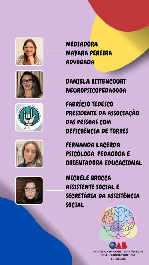 A programação será conduzida por especialistas renomados na área, incluindo a advogada e presidente da Comissão Mayara Pereira, a neuropsicopedagoga Daniela Bittencourt, o presidente da Associação das Pessoas com Deficiências de Torres (ADET) Fabrício Tedesco, a psicóloga e orientadora educacional Fernanda Lacerda e a secretária da Assistência Social, Michele Brocca.