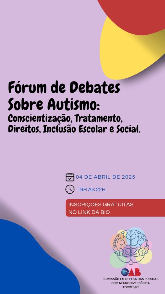 A Ordem dos Advogados do Brasil – OAB Subseção de Torres, por meio de sua Comissão em Defesa dos Direitos das Pessoas com Neurodivergência, promoverá no próximo dia 04 de abril, das 19h às 22h, o Fórum de Debates Sobre Autismo. O evento, que ocorrerá no auditório da sede da OAB, situada na Rua Dr. Ivam Roque Sá Brocca, nº 638, tem como objetivo iniciar o mês de conscientização sobre o Autismo, abordando temas fundamentais como conscientização, tratamento, direitos e inclusão escolar e social das pessoas com neurodivergência.