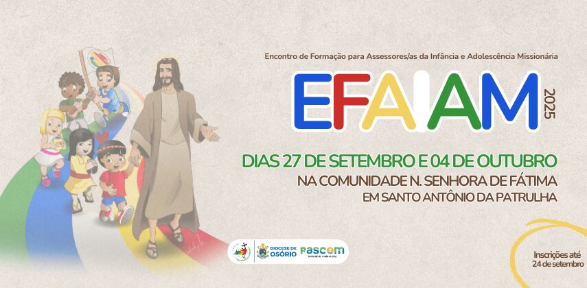 A Diocese de Osório, por meio do Conselho Missionário Diocesano (COMIDI), promoverá nos dias 27 de setembro e 4 de outubro de 2025, sábados, o Encontro de Formação para novos Assessores da Infância e Adolescência Missionária (EFAIAM), destinado a jovens, a partir dos 16 anos, e adultos que desejam se dedicar à missão de acompanhar grupos de crianças e adolescentes em suas comunidades. A formação acontecerá na comunidade Nossa Senhora de Fátima, localizada na Rua Edemar da Silva Braga, nº 305, Bairro Várzea, em Santo Antônio da Patrulha, na Paróquia Santo Antônio. A formação é aberta a participantes de todas as paróquias da Diocese.