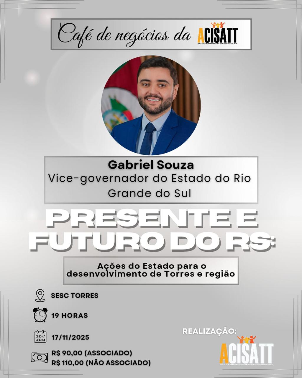 A palestra promovida pela Associação Comercial, Industrial, de Serviços e Agropecuária de Torres (ACISATT), que receberá o vice-governador do Rio Grande do Sul, Gabriel Souza, foi transferida para o dia 17 de novembro, às 19h, no SESC Torres.