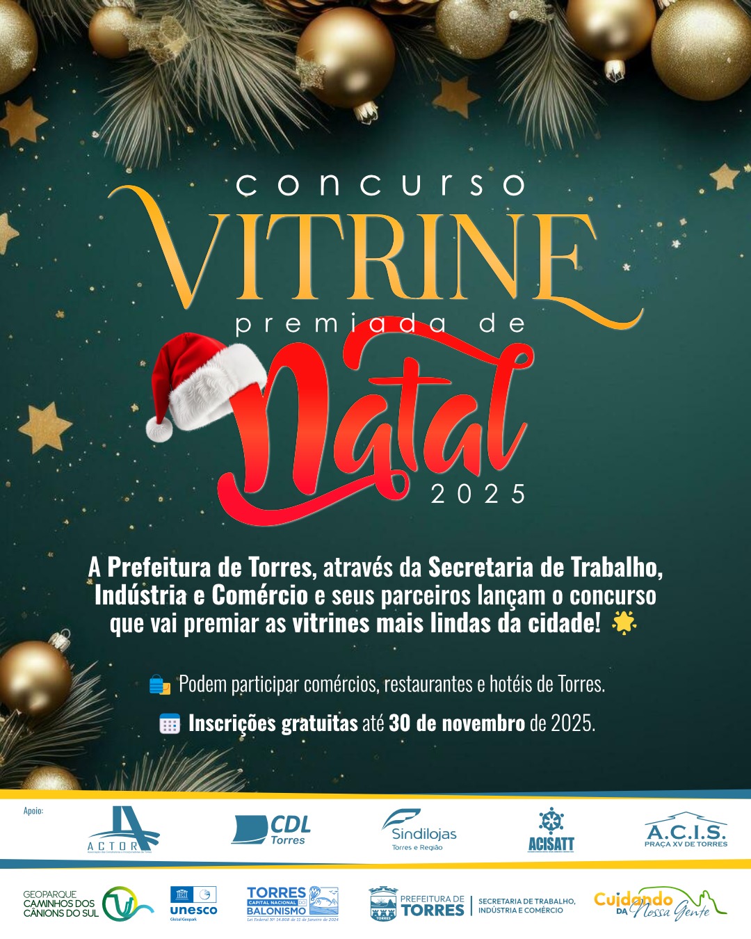A Prefeitura Municipal de Torres, por meio da Secretaria de Trabalho, Indústria e Comércio (SMTIC), em parceria com a ACTOR, CDL, Sindilojas, ACISATT e Associação da Praça XV, além do apoio das Secretarias de Turismo e de Cultura lança o Concurso de Vitrine de Natal 2025. A iniciativa tem como objetivo valorizar o comércio local durante o período natalino. O concurso busca incentivar a decoração de vitrines comerciais, restaurantes e hotéis da cidade.