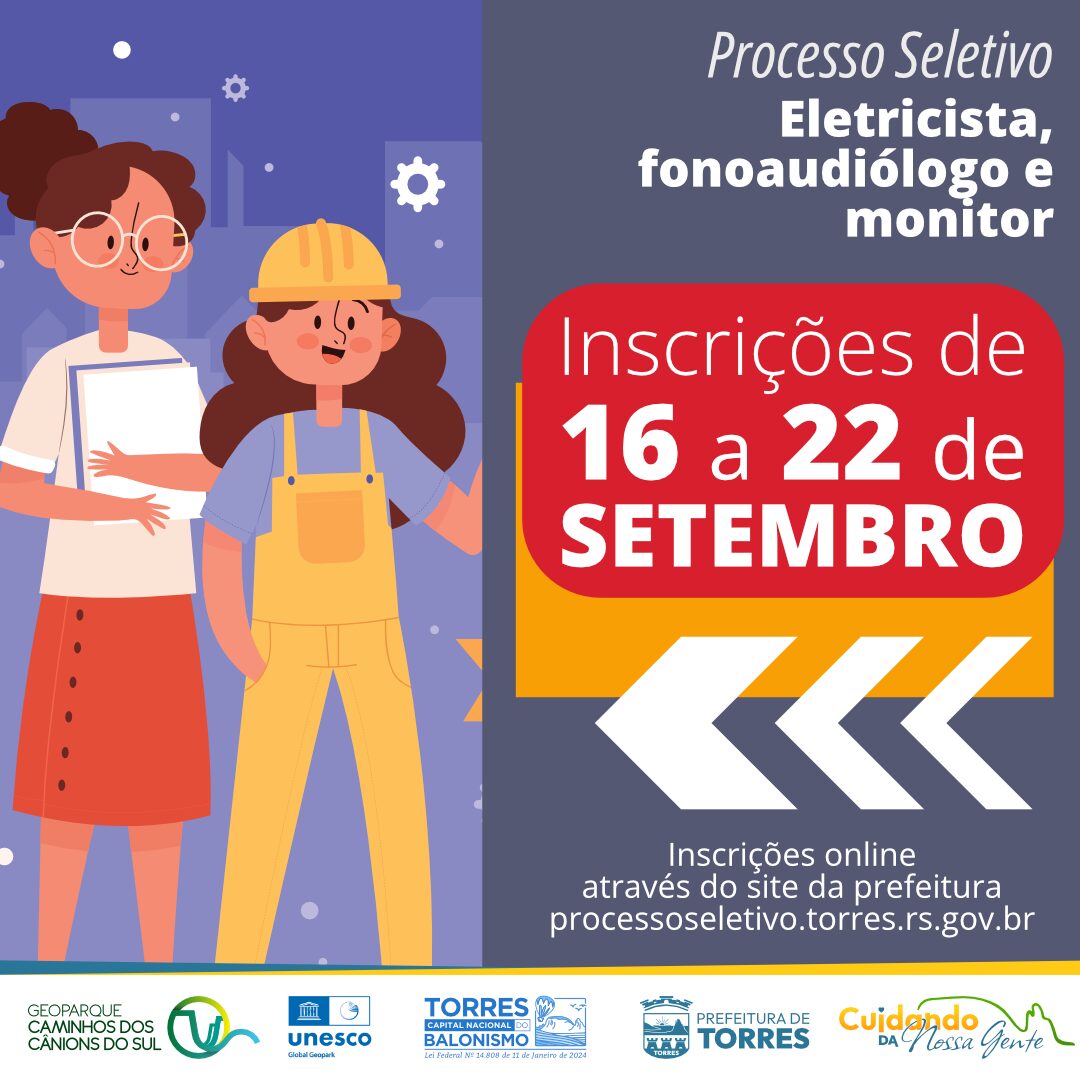 Prefeitura de Torres abriu inscrições para Processo Seletivo Simplificado destinado à formação de cadastro reserva em diferentes áreas. As vagas são para Eletricista, Fonoaudiólogo e Monitor/Visitador, com cargas horárias e remunerações variadas. As inscrições podem ser feitas exclusivamente de forma online, entre os dias 16 e 22 de setembro de 2025.