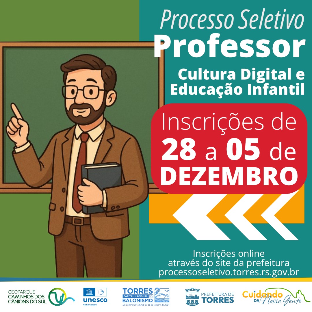 A Prefeitura de Torres informa que estão abertas as inscrições para o Processo Seletivo destinado à contratação temporária de profissionais para a Secretaria Municipal de Educação. As vagas são para as funções de Professor de Educação Infantil e Professor de Educação Básica em Cultura Digital.
