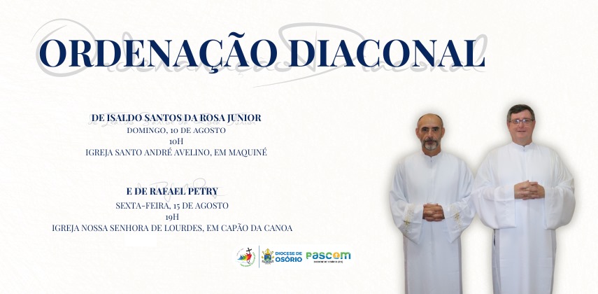Dois novos diáconos permanentes servirão à Diocese de Osório a partir de agosto, depois de um processo longo de estudos e amadurecimento vocacional. Isaldo Santos da Rosa Junior será ordenado no dia 10 de agosto, domingo, às 10h, na igreja Santo André Avelino, no Centro de Maquiné.