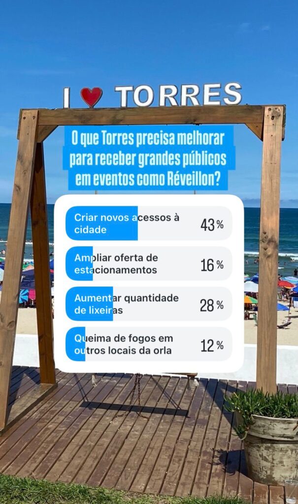 A Rádio Maristela 106.1 FM levou essa inquietação à audiência. Em enquete realizada nos stories do Instagram, a pergunta foi direta: “O que Torres precisa melhorar para receber grandes públicos em eventos como o Réveillon?” Em 24 horas, 67 pessoas participaram. O resultado aponta prioridades claras: 43% defendem a criação de novos acessos à cidade para melhorar o fluxo de entrada e saída, especialmente em horários de pico; 28% indicam a necessidade de ampliar o número de lixeiras e reforçar a coleta de resíduos durante todo o evento, reduzindo o acúmulo de lixo na areia; 16% apontam a falta de estacionamentos, sugerindo alternativas organizadas e temporárias para absorver a demanda; e 12% propõem a descentralização da queima de fogos ao longo da orla, como forma de distribuir melhor o público e aliviar a concentração em um único ponto.