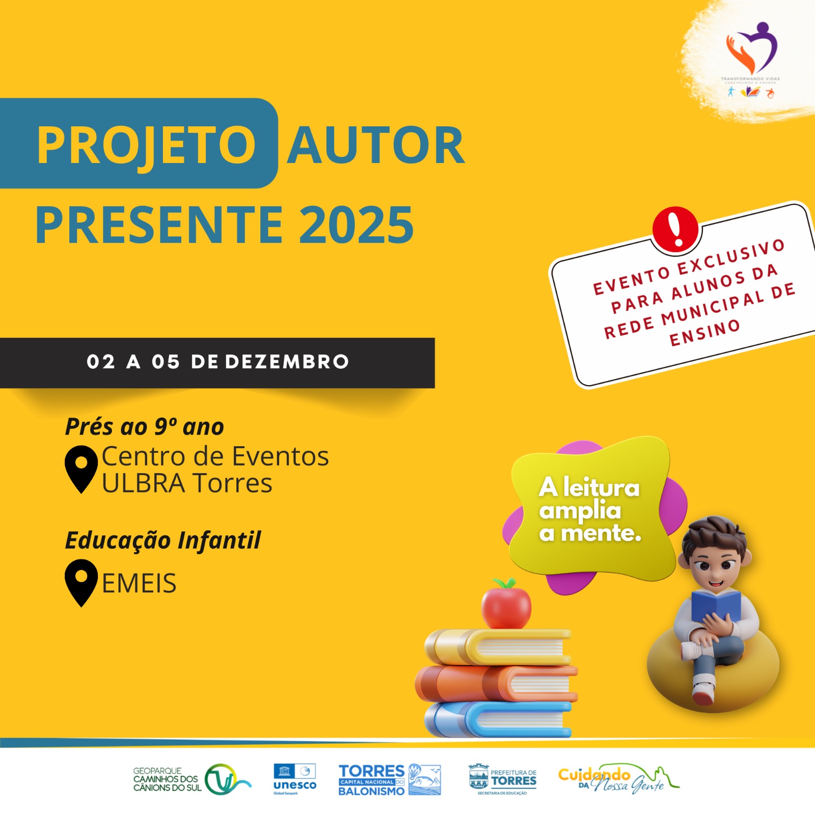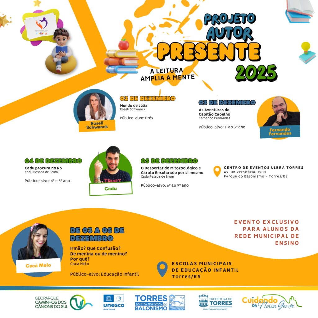 A Secretaria Municipal de Educação (SME) de Torres está preparando a edição de 2025 do Projeto Autor Presente. O evento ocorrerá na próxima semana, no Centro de Eventos da ULBRA Torres e na Escolas Municipais de Educação Infantil.