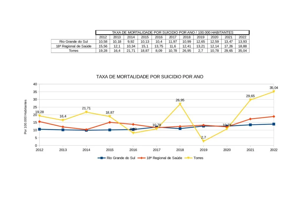 Os dados apresentados no município de Torres, liga o sinal de alerta. Os dados são feitos em comparação a cada 100 mil habitantes e neste cenário, no ano de 2022, a cidade de Torres tem 35,04 pessoas que tiveram a própria vida em decorrência da doença. Se for comparar com a 18ª Regional de Saúde, os números são preocupantes, porque a regional apresenta 18,08 e o estado do Rio Grande do Sul, 13,93. Os dados analisados são os de 2022, pois os do ano passado, ainda não são oficiais.