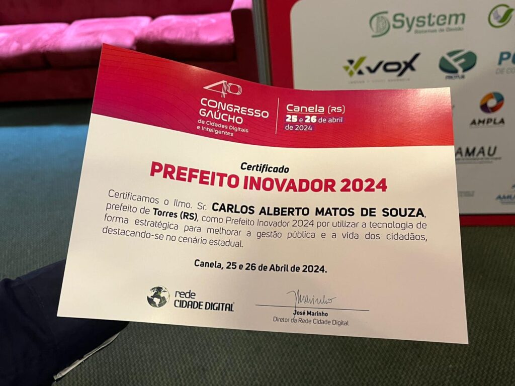 O prefeito Carlos Souza foi agraciado com um dos prêmios mais prestigiados na área da educação do Estado do Rio Grande do Sul durante o 4° Congresso Gaúcho de Cidades Digitais e Inteligentes, que teve início ontem, quinta-feira (25), e encerra hoje, sexta-feira (26), em Canela. Ele recebeu o Prêmio Prefeito Inovador 2024 em nome de Torres, em reconhecimento à implementação bem-sucedida do Projeto de Reconhecimento Facial nas Escolas. A cerimônia de premiação ocorreu ontem, como parte da programação do Congresso.