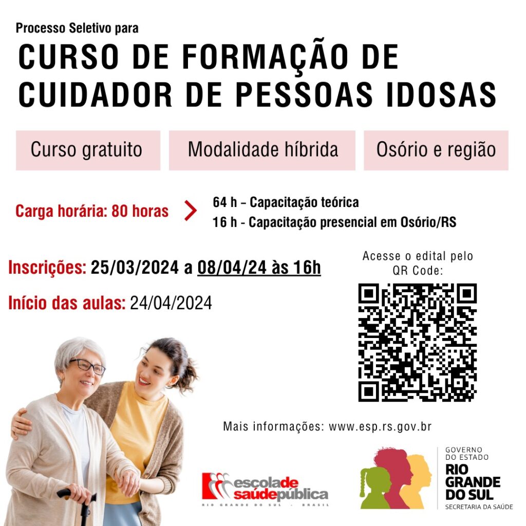 A Escola de Saúde Pública (ESP), vinculada à Secretaria de Estado da Saúde do Rio Grande do Sul (SES), está com inscrições abertas para o Processo Seletivo do Curso de Formação de Cuidador de Pessoas Idosas até o dia 08 de abril, próxima segunda-feira.